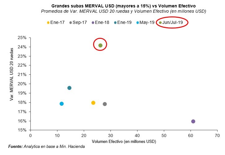 Entre junio y julio, el Merval en dólares subió casi 25% promedio con un volumen diario que osciló los U$S 30 millones. Si nos limitamos a las subas “rápidas”, de 20 ruedas por ejemplo, la de junio / julio no sólo es la mayor suba, sino la de mayor volumen (a excepción de la observada en ene-18, con más volumen pero con menor incremento). Esto implica que el mercado está bastante sesgado a un buen resultado y las PASO no serían sorpresa.