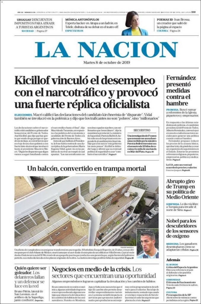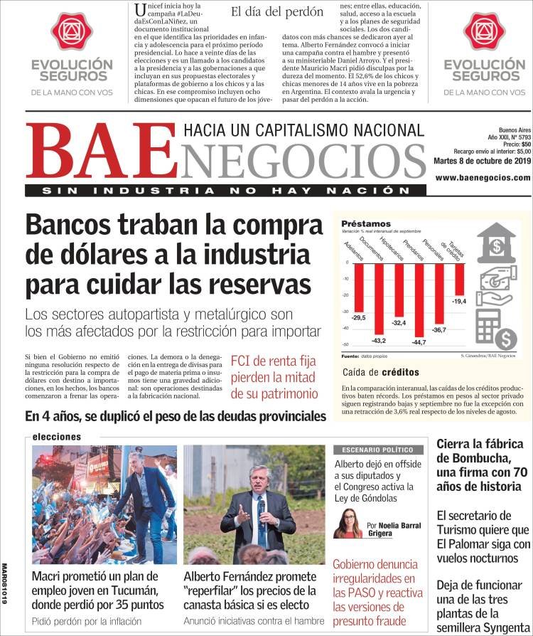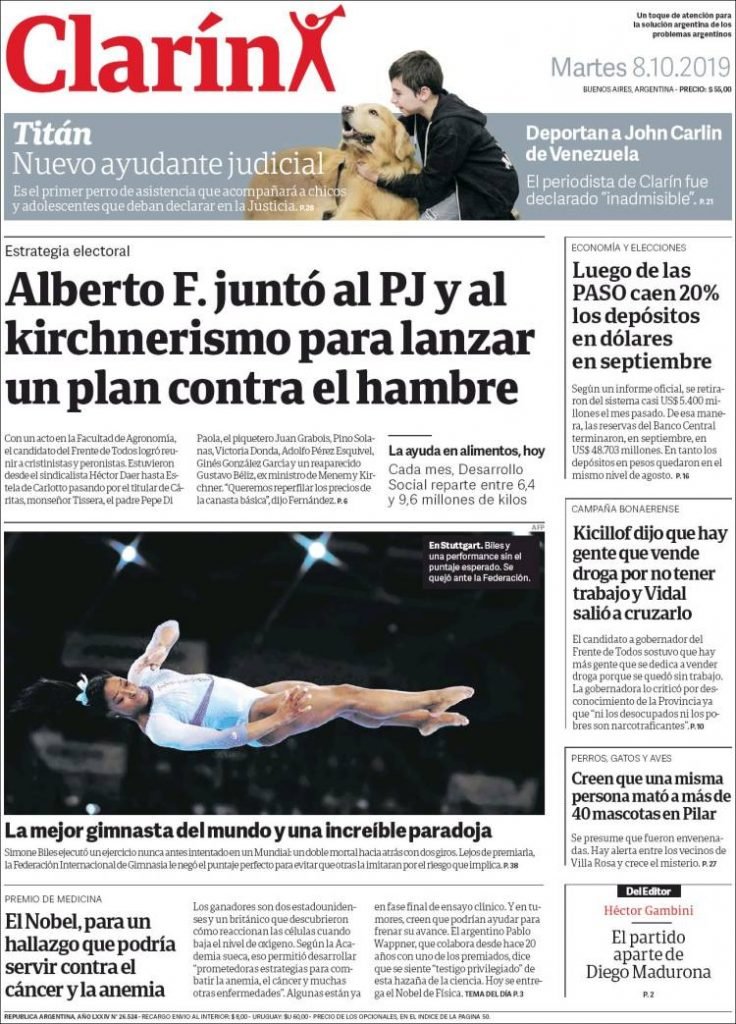 A continuación, repasamos las tapas de los diarios del martes 8 de octubre. El título principal de varios matutinos es el plan contra el hambre que presentó Alberto Fernández. Macri estuvo en Tucumán y arengó a sus seguidores en una provincia donde gobierna un “ultra k” como Juan Manzur.