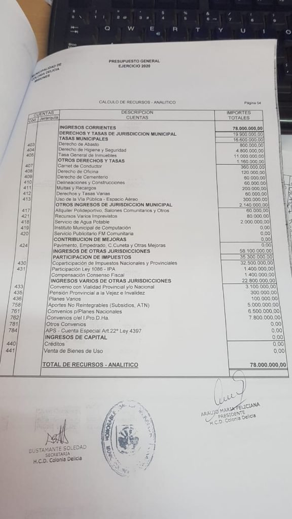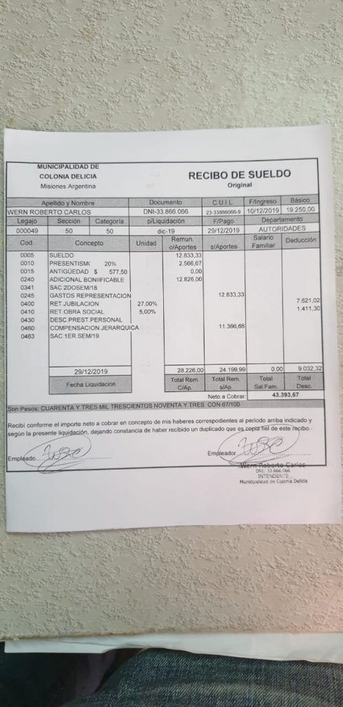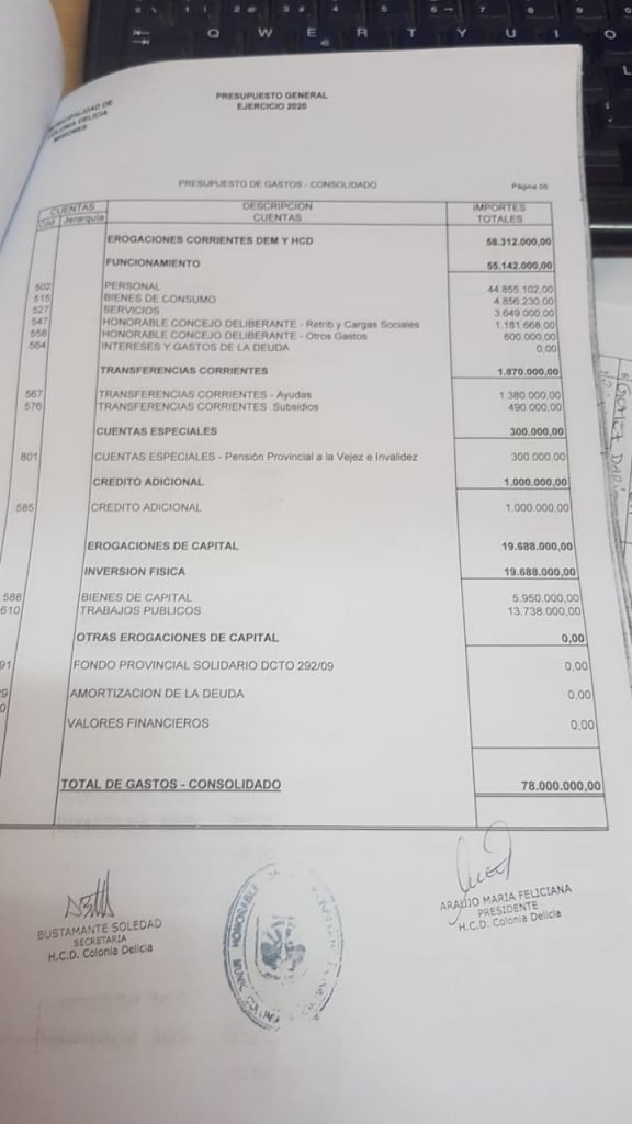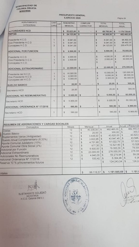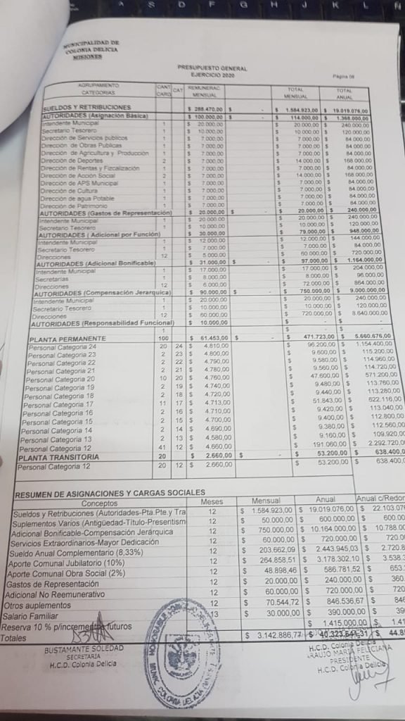 El actual intendente de Colonia Delicia no cobra ni cobrará 155 mil pesos como se hizo correr a través de redes sociales, sino 57 mil pesos, más un 10% de aumento previsto en el presupuesto real. Para verificar los datos reales, se acompaña una copia del presupuesto general de gastos y recursos aprobados el viernes pasado en el concejo, con sellos y firmas, la aclaración del Concejo Deliberante y los dos últimos recibos de sueldo del alcalde.