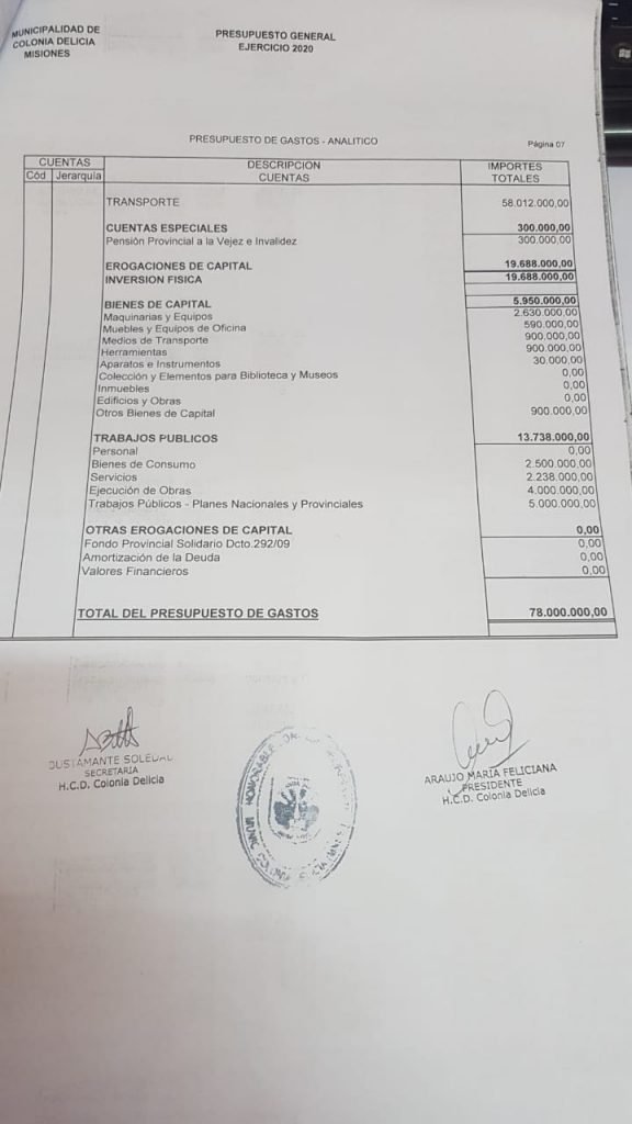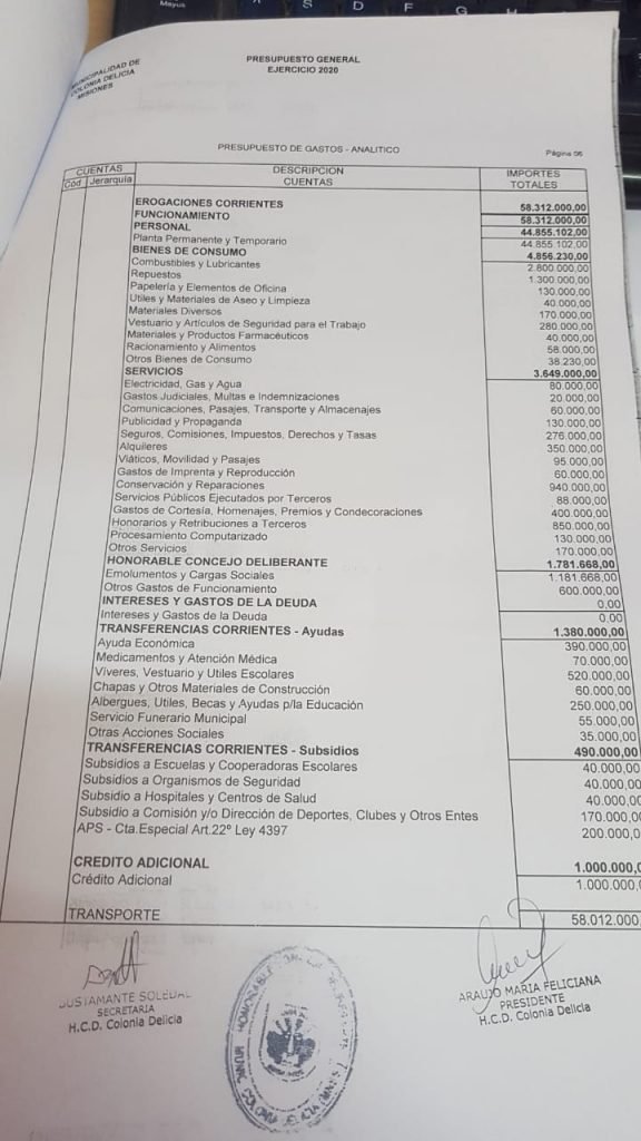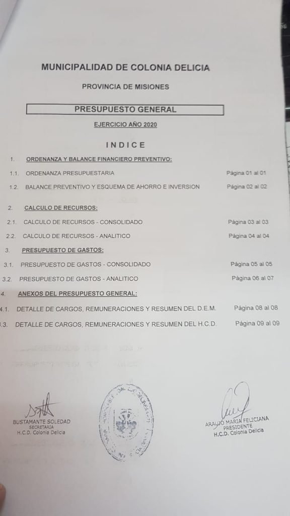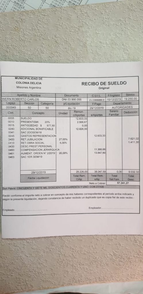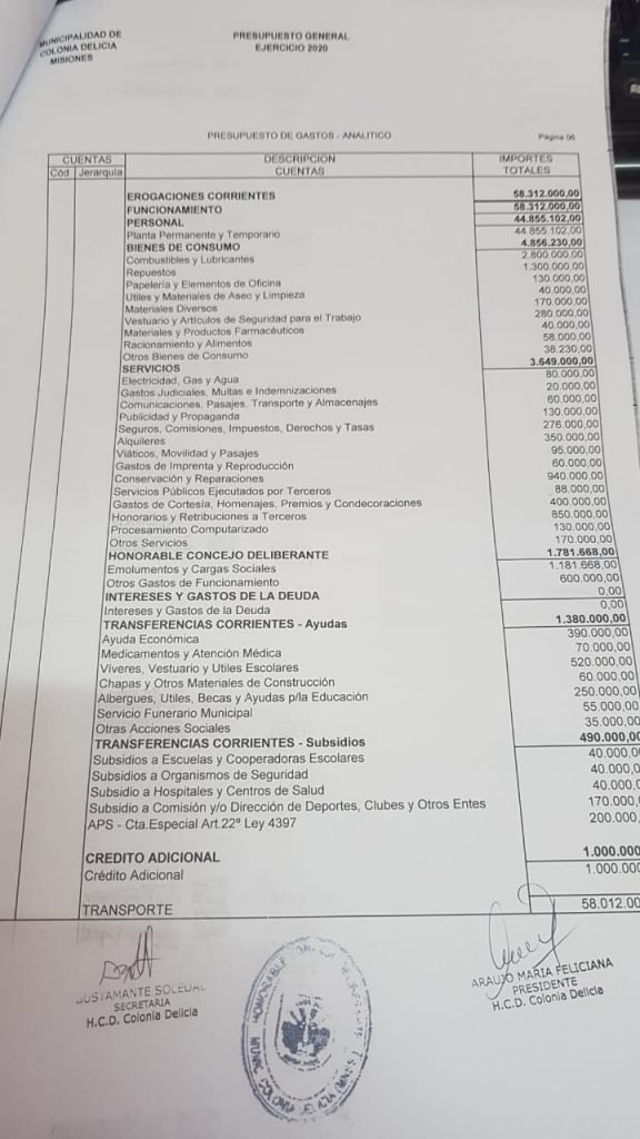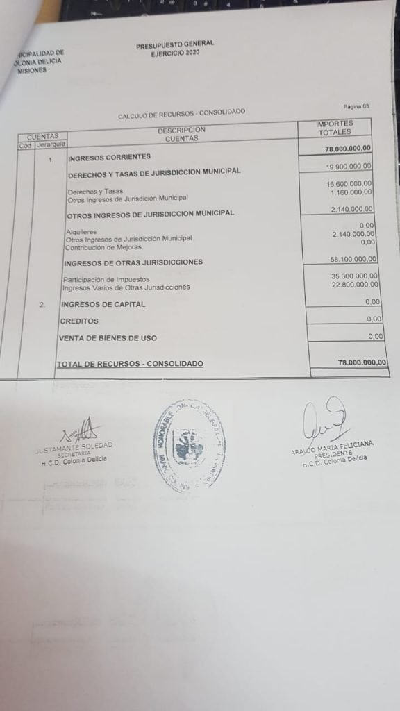 El actual intendente de Colonia Delicia no cobra ni cobrará 155 mil pesos como se hizo correr a través de redes sociales, sino 57 mil pesos, más un 10% de aumento previsto en el presupuesto real. Para verificar los datos reales, se acompaña una copia del presupuesto general de gastos y recursos aprobados el viernes pasado en el concejo, con sellos y firmas, la aclaración del Concejo Deliberante y los dos últimos recibos de sueldo del alcalde.