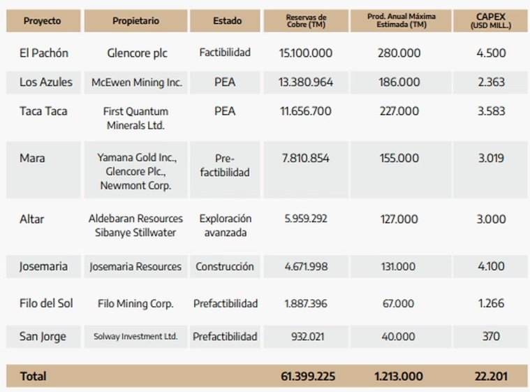 De acuerdo a un informe oficial son 20 los proyectos de cobre en el país, donde sólo uno estaría más cercana a la producción y la construcción, se trata de Josemaría, en San Juan, operado por Lundin Mining. Además, en San Juan está el proyecto El Pachón de Glencore, en etapa de factibilidad, previo a la construcción; también Los Azules y Filo de Sol, estos cuatro son los más avanzados.
