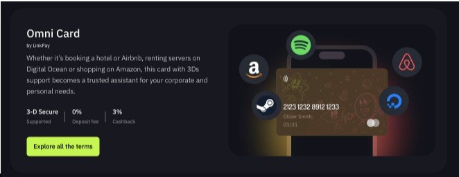 LinkPay emite tarjetas virtuales Omni basadas en Visa y Mastercard, que aceptan pagos internacionales de cualquier tipo. La tarjeta ofrece 3 % de cashback en todos los gastos, lo que hace que cada compra sea rentable.