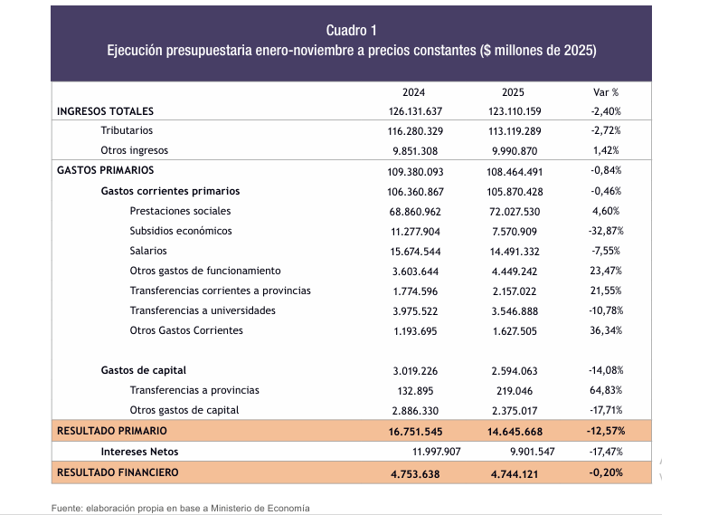 Por Isidro Guardarucci / FIEL – Radiografía del superávit. 2025 llegó a su fin y los números fiscales van a apareciendo. La información más reciente es la ejecución a noviembre, es decir, sólo queda por agregar el último mes del año. La foto del pre cierre de año muestra un superávit primario de $14,6 billones, un 12,6% más bajo que el observado en igual período de 2024 (cuando se compara a precios constantes, es decir, neto del efecto inflacionario). Por su parte, el balance global, que incluye el pago de intereses, se ubicó en $4,7 billones. Este número, favorecido por el registro contable de los instrumentos capitalizables cuyos servicios se reflejan íntegramente debajo de la línea, es muy similar a lo observado un año atrás.