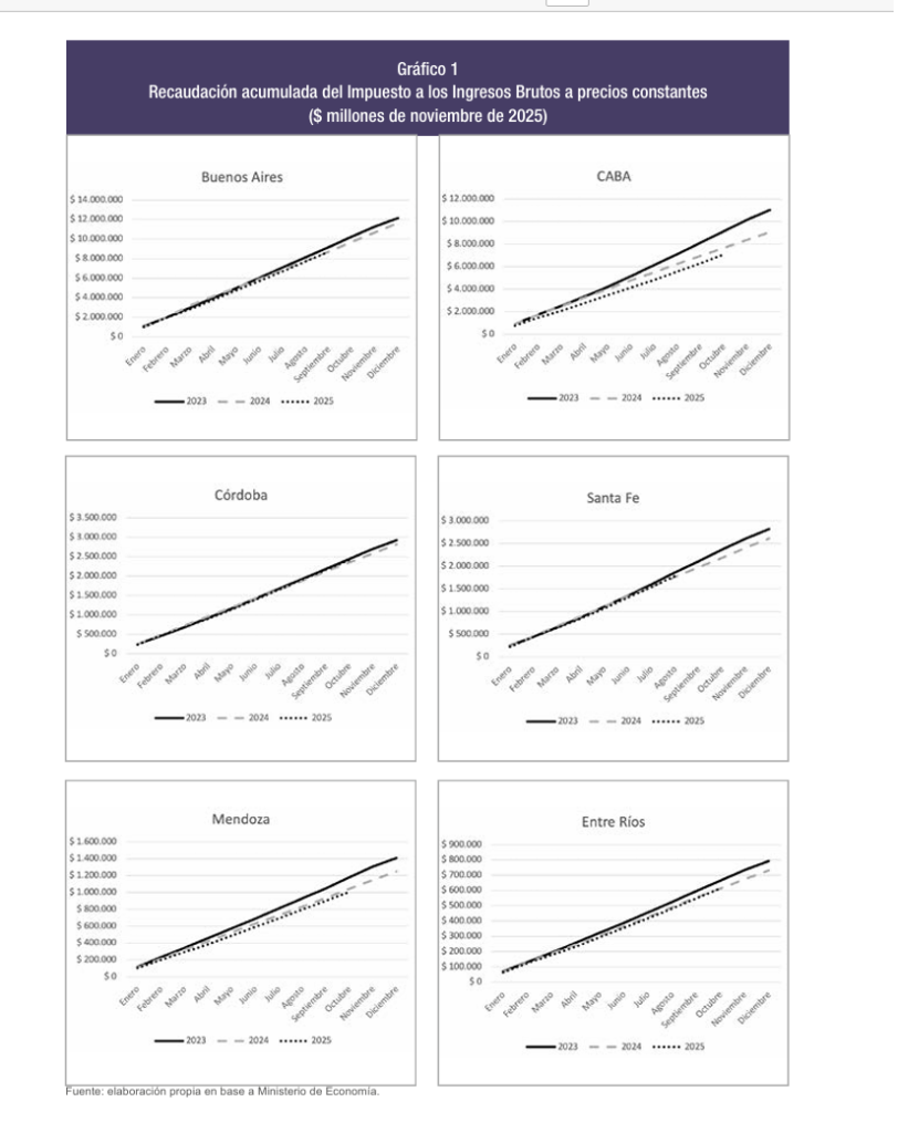 La situación luce más sensible si se compara la recaudación provincial y su dinámica reciente. Según los datos más actuales, la recaudación acumulada del Impuesto a los Ingresos Brutos está por debajo de los registros tanto de 2023 como de 2024 (en algunos casos, como en Córdoba, la situación es similar). En resumen, ni los recursos de 2023 ni la licuación del gasto de 2024. Las provincias suelen ser algo lentas para mostrar sus números, pero no hay dudas de que la foto de cierre de 2025 mostrará a varios fiscos subnacionales en la situación más incómoda de los últimos años.