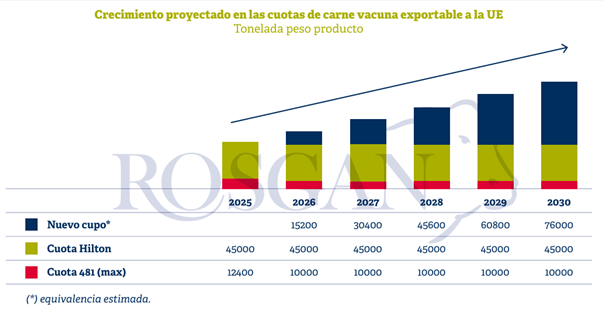 Considerando los distintos contingentes, el volumen total de acceso al mercado europeo para la carne vacuna del Mercosur quedaría conformado por unas 45.000 toneladas anuales de la Cuota Hilton, hasta 10.000 toneladas de la Cuota 481, y las 76.000 toneladas peso producto del nuevo cupo adicional a partir del quinto año de implementación.
