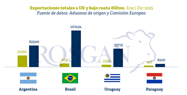 En el caso de Argentina, que cuenta con una asignación dominante de 29.500 toneladas por ciclo comercial dentro de la Cuota Hilton, las exportaciones fuera del contingente duplicaron en 2025 a las realizadas bajo cuota. Para otros orígenes, especialmente Brasil, los excedentes resultaron aún más significativos.