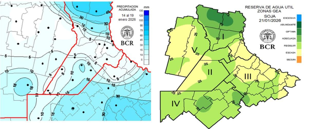 El reporte correspondiente a la semana al 22 de enero de 2026 revela que las lluvias de los últimos siete días fueron altamente irregulares, dejando a un 65% de la región casi al margen de las precipitaciones, con registros superiores a 15 mm solo en el noreste y sur del área núcleo. Se destacaron Carlos Pellegrini con 55 mm y Chacabuco con 42 mm, mientras que amplias zonas permanecieron con aportes mínimos.