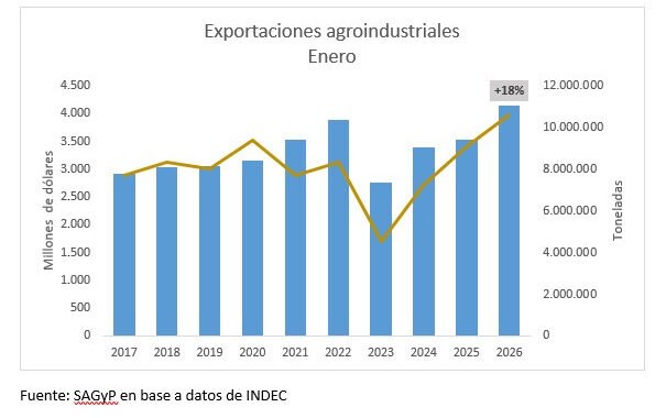 La Secretaría de Agricultura, Ganadería y Pesca del Ministerio de Economía de la Nación informa que el mes de enero continúa mostrando la tendencia creciente en las exportaciones agroindustriales. Se exportaron productos por 4.152 millones de dólares y 10,63 millones de toneladas, representando un incremento del 18% en valor y del 17% en volumen respecto de enero de 2025. Son los valores más altos de los últimos 10 años, según los datos procesados por la Subsecretaría de Mercados Agroalimentarios e Inserción Internacional, en base a las estadísticas de INDEC.