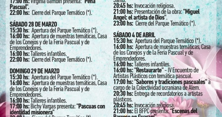 15,30 horas: Apertura del Parque Temático (). 16,00 horas: Apertura de muestras temáticas, Casa de los Conejos y de la Feria Pascual y de Emprendedores. 16,00 horas: Talleres infantiles. 16,00 horas: “RestaurARTE” – IV Encuentro de artistas plásticos con temática pascual. 17,00 horas: “Sabores y tradiciones pascuales” a cargo de la Colectividad Ucraniana de Alem. 20,30 horas: Entrega de presentes recordatorios a artistas plásticos. 20,45 horas: Invocación Religiosa. 21,00 horas: El Ballet Folklórico del Parque del Conocimiento presenta “Escenas del Barroco en Guaraní”. 21,45 horas: Los Núñez presentan su disco “Yvy Purahéi” (El canto de la Tierra) con la participación musical de Vanesa Avellaneda y la presentación estelar de NAHUEL PENNISI. 23,00 horas: Cierre del Parque Temático ().