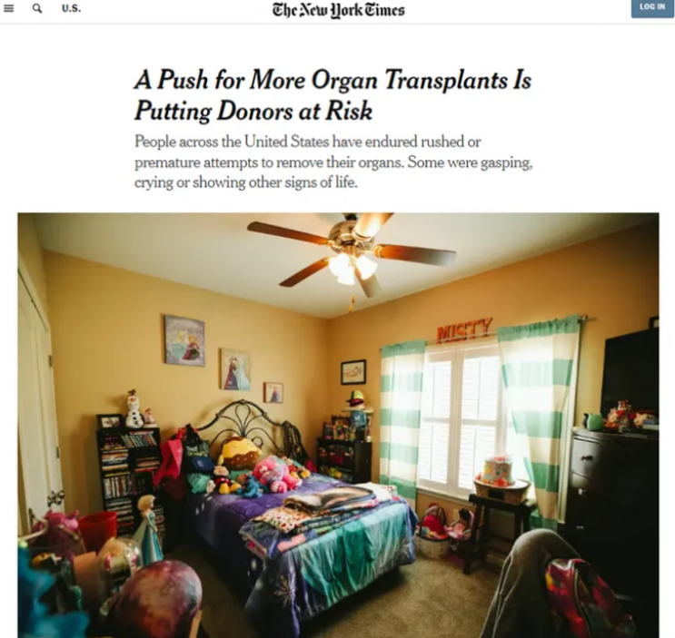 En julio de 2025, The New York Times publicó un reportaje de investigación sobre las prácticas de donación tras la muerte circulatoria (DCD) en Estados Unidos. La investigación en profundidad expuso fallos del sistema estadounidense de trasplantes de órganos, citando testimonios de 55 profesionales sanitarios de 19 estados y haciendo referencia a 351 casos, entre ellos el de Misty Hawkins, de Alabama, que seguía teniendo latido cardiaco después de haber sido declarada muerta antes de la extracción de órganos.