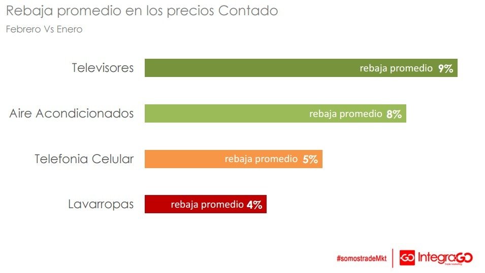 • La categoría de televisores es la de mayor descuentos otorga con un promedio del -9%, seguida por aire acondicionados con el -8%, con descuentos menores se encuentran los teléfonos celulares -5% y lavarropas -4%.