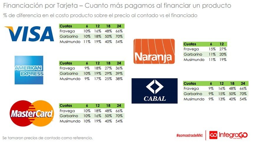 La diferencia de precios por pago de contado y con tarjeta de crédito Visa es de entre el 10% en seis cuotas y el 70% en 24 cuotas, aunque varía de acuerdo a la cadena donde se adquiera el producto. Con American Express, es de entre el 9% y 38% mientras que con MasterCard el diferencial es de entre el 10% y el 70%. Tarjeta Naranja, en tanto, ofrece costo de financiación de entre 11% y 27% y Cabal, de entre 9% y 70%.