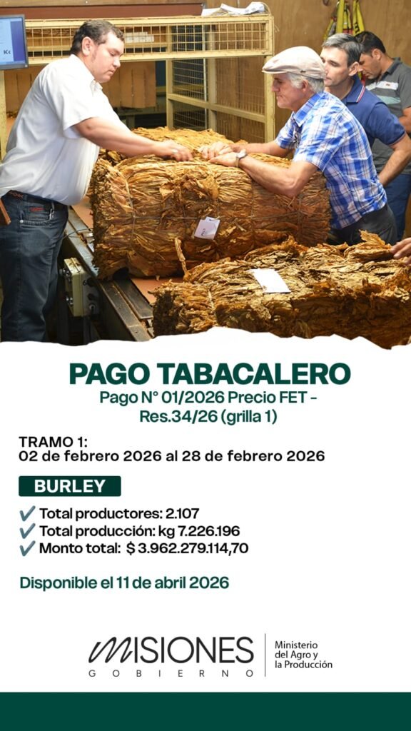 El pago se encuadra en la Resolución 34/26 (grilla 1) del precio FET, que regula la distribución de fondos para el sector tabacalero. En este caso, se liquidan 7.226.196 kilos de producción, con un impacto directo sobre miles de unidades productivas distribuidas en la provincia.