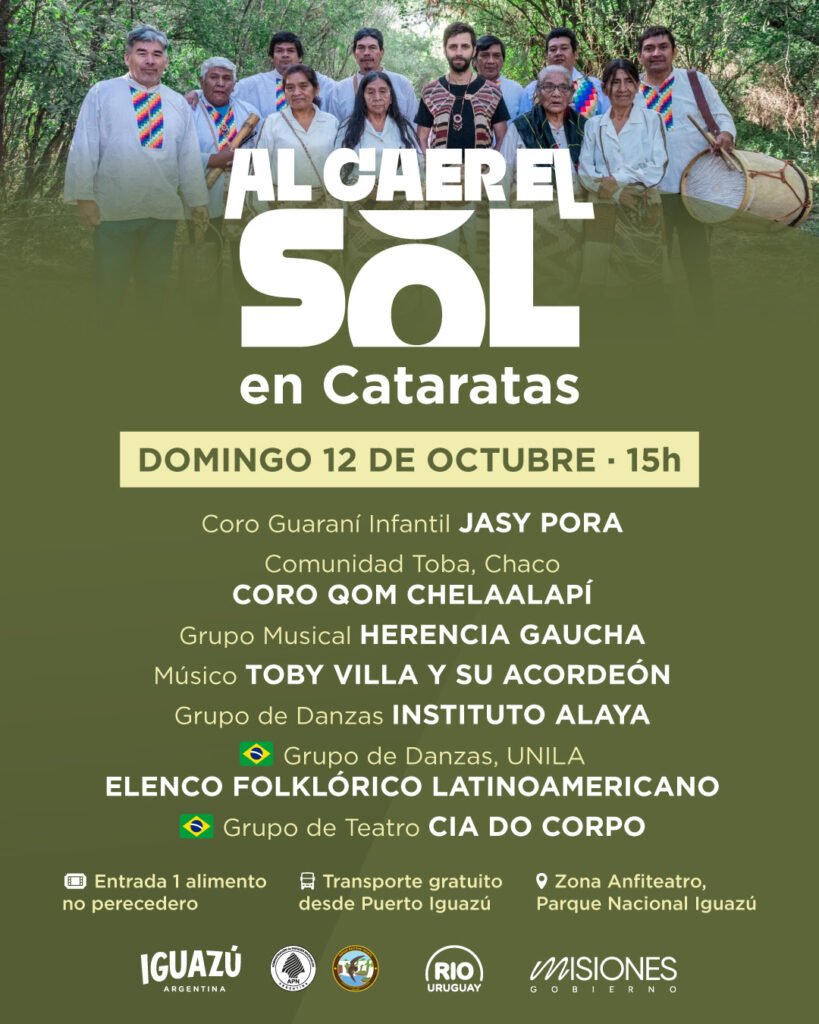 Este domingo 12 de octubre, el anfiteatro del parque será escenario de una nueva edición del evento cultural “Al Caer el Sol en Cataratas”, organizado por Iguazú Argentina S.A. junto a la Secretaría de Estado de Cultura de Misiones y el Parque Nacional Iguazú. Con entrada libre y gratuita, la jornada reunirá a artistas de Argentina, Brasil y Paraguay en una tarde de música, danza y sabores regionales. Al público asistente se le solicitará acercarse con un alimento no perecedero que luego será destinado a merenderos locales.