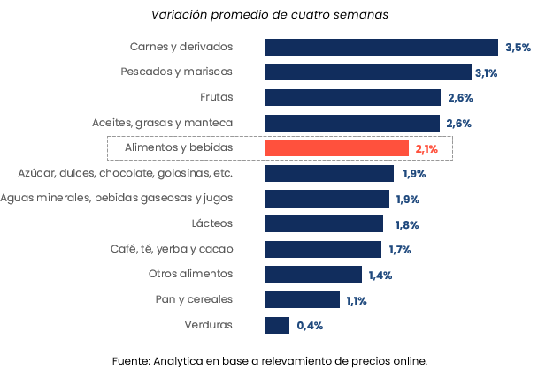 El informe detalla que las carnes y derivados registraron el mayor incremento en las últimas cuatro semanas, con una suba del 3,5%, seguidos por pescados y mariscos (+3,1%) y frutas (+2,6%).