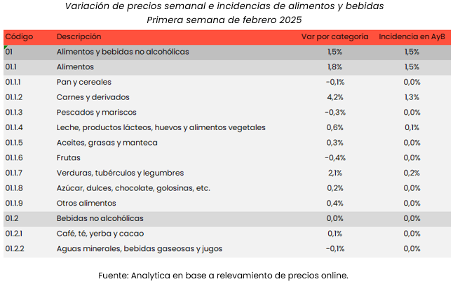 El primer relevamiento de precios de alimentos y bebidas en febrero registró una suba del 1,5% semanal en el Gran Buenos Aires, con una aceleración respecto a las semanas previas debido al aumento de la carne vacuna. En tanto, el promedio de variación de las últimas cuatro semanas se ubicó en 2,1%, mientras que la proyección de inflación para el mes es del 2,0%.
