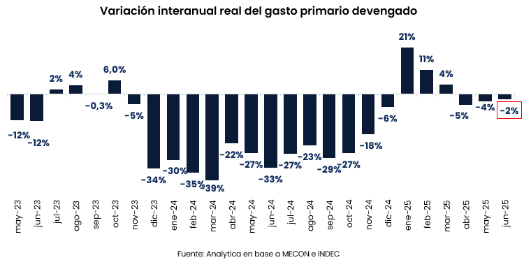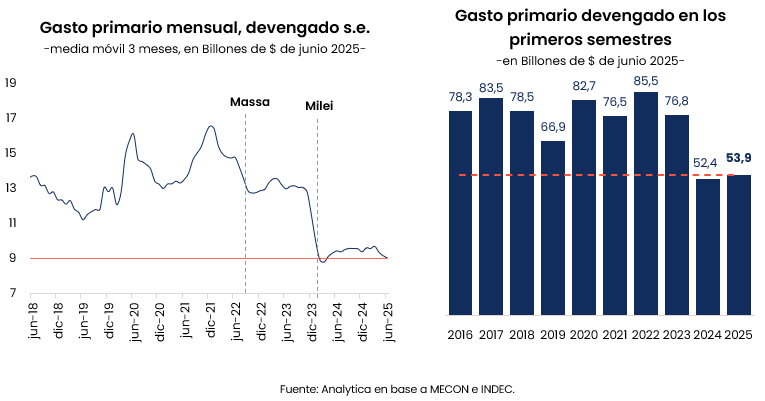 El gasto primario devengado acumuló en el primer semestre de 2025 un incremento real del 2,8% interanual, según el último Monitor de Gasto Primario de la consultora Analytica. Sin embargo, el dato de junio mostró una baja real del 2,4%, lo que refleja una desaceleración tras el impulso inicial del año.