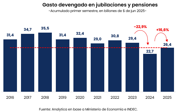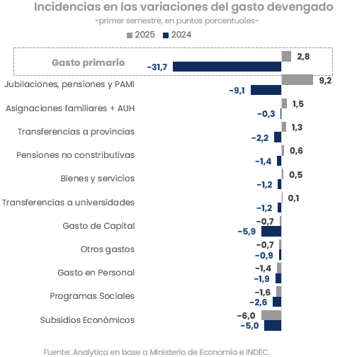 El gasto primario creció 2,8% en el semestre impulsado por jubilaciones, pero los subsidios cayeron 57%. La consultora Analytica advirtió que, pese a una desaceleración en junio, el gasto primario acumuló un alza real en la primera mitad del año. El ajuste se concentró en subsidios económicos y obra pública, mientras las transferencias a provincias se dispararon casi 96%.