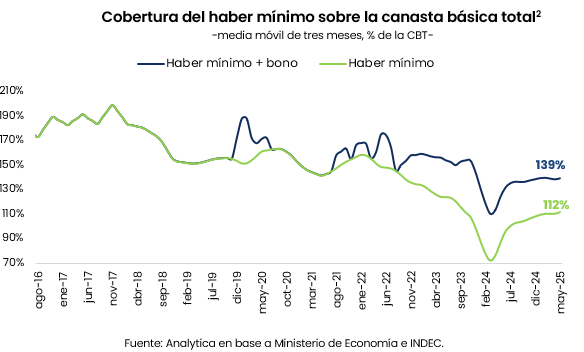El 68,5% de los jubilados cobra su haber por moratoria. La mayoría percibe el haber mínimo ($379.295 en marzo), que incluye un refuerzo de $70.000 que, en términos reales, cayó 31,1% interanual en el primer semestre. De haberse actualizado por la fórmula de movilidad, el bono debería ser de $126.404, según estimaciones de Analytica.