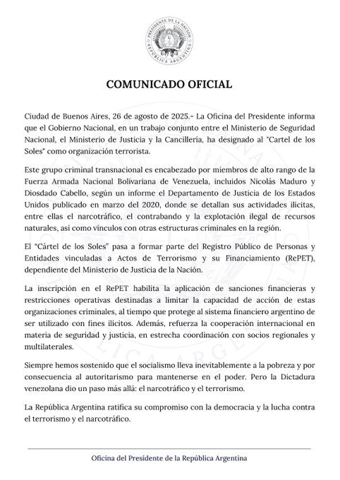 El Gobierno argentino sostuvo que la medida responde a la necesidad de “defender la democracia y la lucha contra el terrorismo y el narcotráfico”. En el comunicado, la Oficina del Presidente advirtió: “Siempre hemos sostenido que el socialismo lleva inevitablemente a la pobreza y por consecuencia a utilizar al terrorismo para mantenerse en el poder. Pero la dictadura venezolana no ayuda más a sus pueblos, sino que los destruye”.
