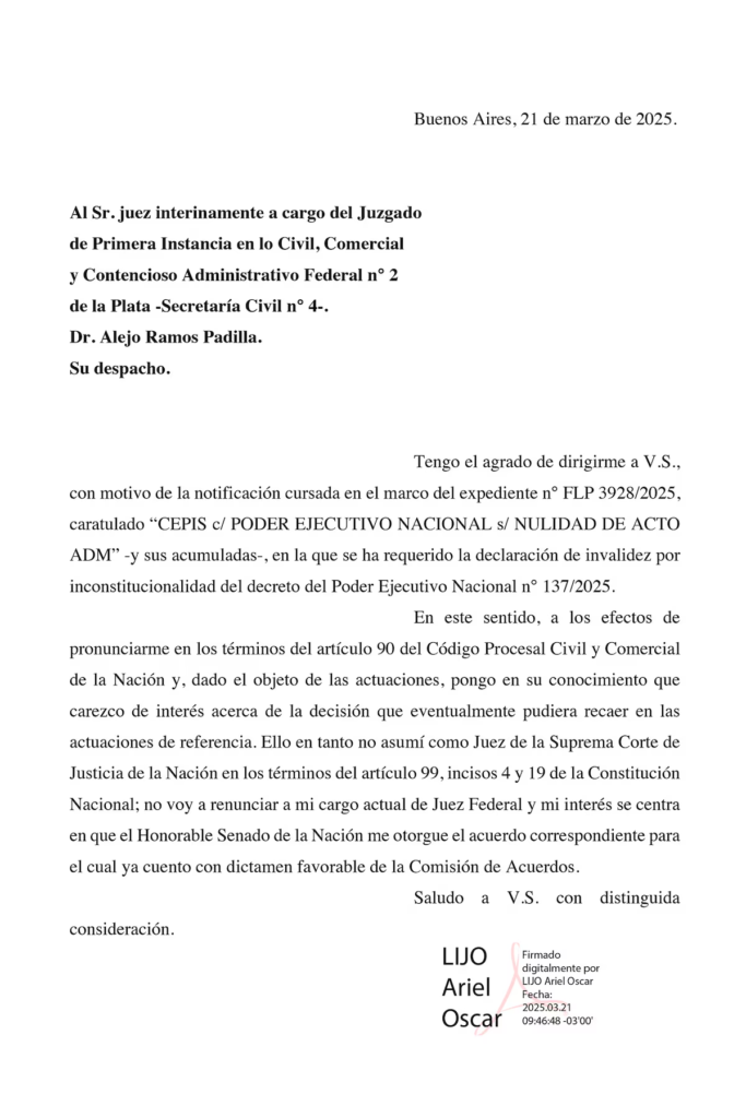 “A los efectos de pronunciarme en los términos del artículo 90 del Código Procesal Civil y Comercial de la Nación y, dado el objeto de las actuaciones, pongo en su conocimiento que carezco de interés acerca de la decisión que eventualmente pudiera recaer en las actuaciones de referencia. Ello en tanto no asumí como Juez de la Suprema Corte de Justicia de la Nación en los términos del artículo 99, incisos 4 y 19 de la Constitución Nacional; no voy a renunciar a mi cargo actual de Juez Federal y mi interés se centra en que el Honorable Senado de la Nación me otorgue el acuerdo correspondiente para el cual ya cuento con dictamen favorable de la Comisión de Acuerdos”, expresó Lijo.