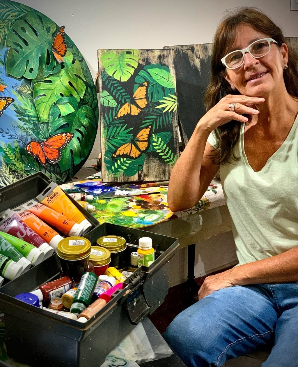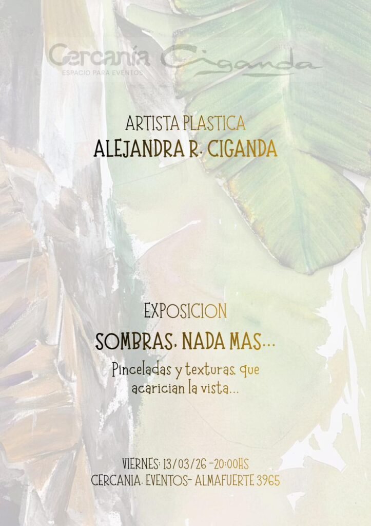 La artista plástica, muralista y artesana Alejandra Ciganda inaugura la primera edición de visualización de Artistas Plásticos en Cercanía Eventos, un entorno natural presentando Sombras, nada más …, una serie de 15 obras que convocan la flora y fauna misionera como presencia viva en la obra.