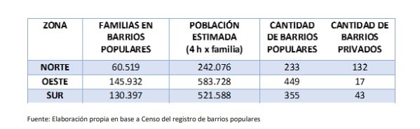 Haciendo una estratificación por zonas del Conurbano, mientras que en la zona norte por cada barrio privado hay 2 barrios populares, en la zona oeste la relación es de 1 por cada 22 y en la zona sur ese número es de 1 a 9.