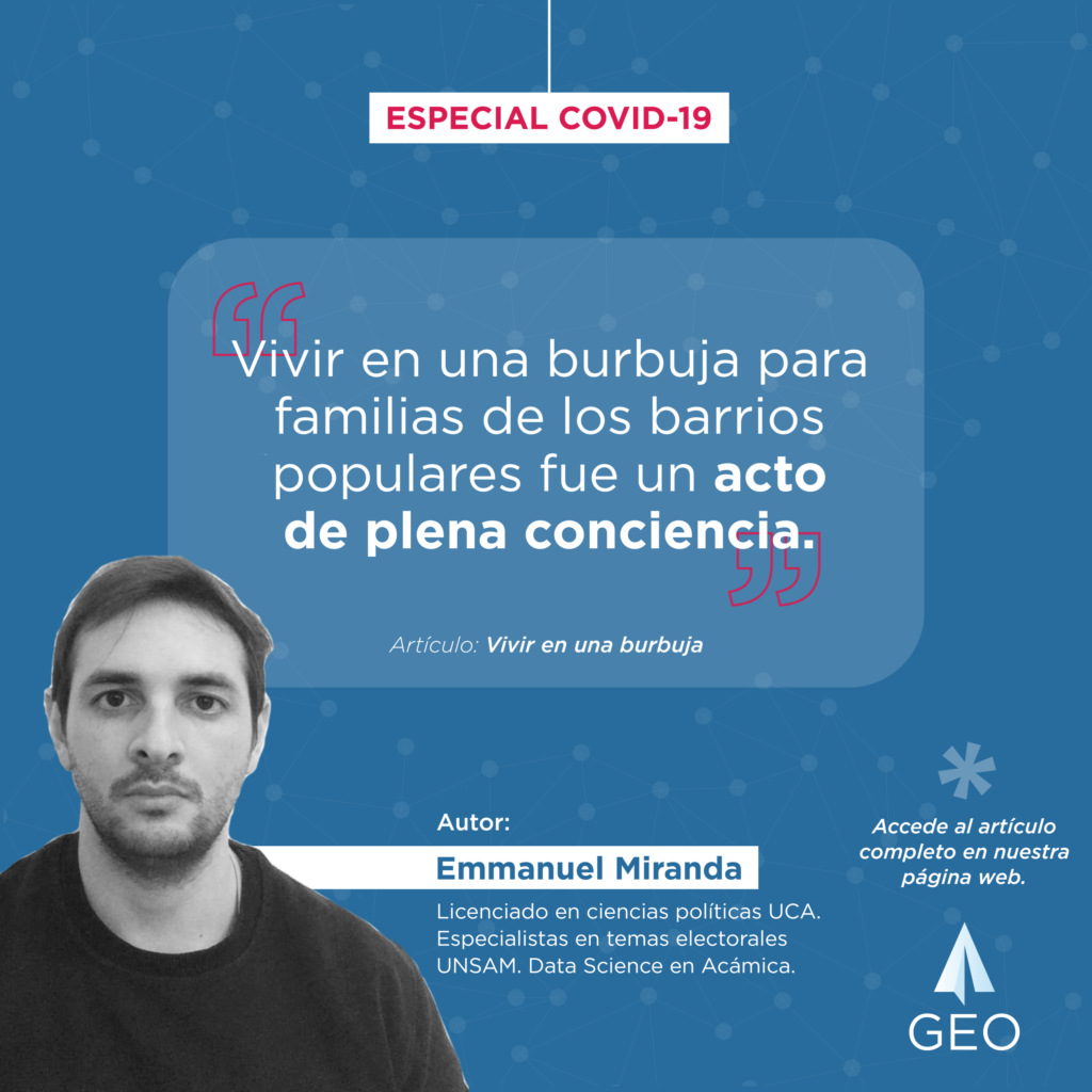 El siguiente artículo se propone analizar lo que comúnmente se llama en el lenguaje popular argentino “vivir en una burbuja”, bajo la perspectiva de las respuestas y vivencias que atravesaron las familias de los barrios privados en contraposición con las familias de los barrios populares en el contexto de pandemia sanitaria.