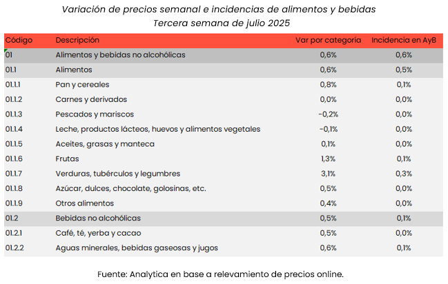 La consultora Analytica registró una variación semanal del 0,6% en los precios de alimentos y bebidas en el Gran Buenos Aires durante la tercera semana de julio. El dato se inscribe en una tendencia de desaceleración inflacionaria, con un promedio de suba del 2,1% en las últimas cuatro semanas para esta categoría.