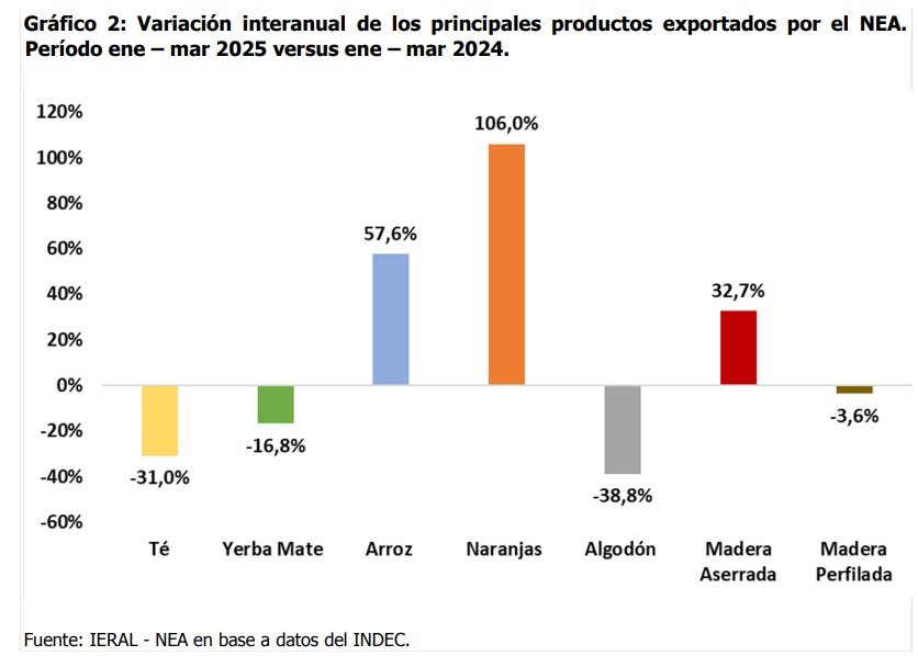 Sin embargo, la inflación del primer trimestre del 2024 llevó a que el ITCRM disminuya progresivamente, a partir de lo cual se observa en el período que va desde abril del 2024 hasta marzo del 2025 donde el tipo de cambio real se ubicó un 9,1% por debajo del promedio de todo el período analizado. Como consecuencia de esto, si bien las exportaciones de la región continuaron creciendo, el ritmo fue considerablemente menor (solamente un +5,4% anual). Sin dudas esta dinámica vuelve cada día más necesario el proceso de reducción de costos productos en nuestro país en general (y en la región NEA en particular) para incrementar la competitividad de nuestras industrias, más allá de la política cambiaría. Esto implica, como fue señalado anteriormente reducir los costos tributarios, laborales, de transporte y logísticos, así como también simplificar las regulaciones que suman costos adicionales indirectos en cada actividad. En este marco, al analizar la dinámica de los principales productos exportados por la región (ver gráfico 2), vemos que al comparar los meses de enero – marzo del corriente año respecto a igual período del año anterior, tres de ellos registraron crecimientos, mientras que cuatro registraron caídas. Dentro de los productos que registraron incrementos interanuales en sus montos exportados (como así también en el volumen físico exportado), se destacan las Naranjas (con un crecimiento del 106%), seguidas por el Arroz (57,6%), y por último la Madera Aserrada (32,7%).