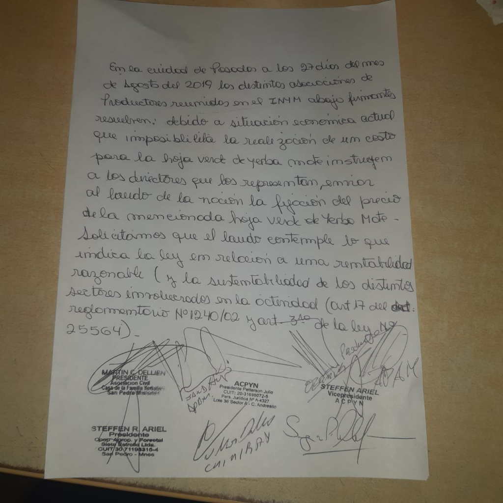 Los productores que hoy firmaron la carta son Hugo Sand (APAM), Julio y Jonás Peterson (ACPYN), Ariel Stefen (ACPYN), Victor Fabián Tarnowyk (ACPYN), C de la Pierre, Martin Dellien (Asociación Civil Casa de la Familia Yerbatera San Pedro), y Roberto Buser (Arya), Rubén “Cacho” Ozeñuk, Nelson Dalcomo (Asociación Chimiray), y Juan José Szychowski.