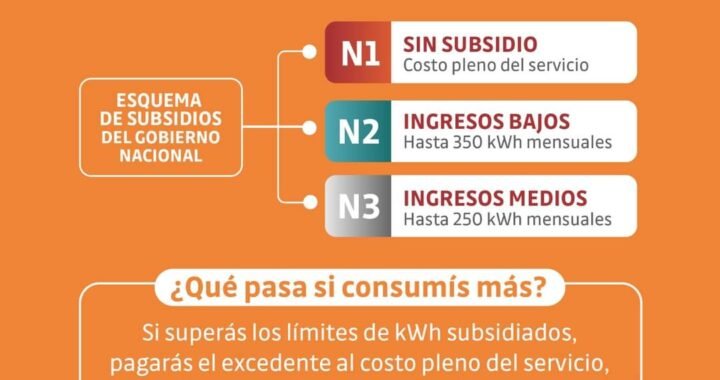 Si el usuario fue categorizado como N2 (bajos ingresos) el Estado nacional subsidia sólo los primeros 350 kWh (kilovatios/hora) consumidos cada mes. La energía que se consuman por encima del tope se factura con tarifa plena, sin subsidios.