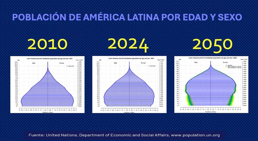 El estudio analiza la evolución de las pirámides poblacionales en Latinoamérica y el Caribe desde 2010 hasta las proyecciones para 2050, evidenciando cómo la base de la pirámide demográfica se estrecha mientras la cima se ensancha. Este fenómeno, denominado modelo de transición demográfica, implica que el grupo de mayor edad representará una porción cada vez más relevante del mercado. En 2100, la proporción de personas mayores de 60 años en la región será mayor que en Asia, América del Norte, Oceanía y África.