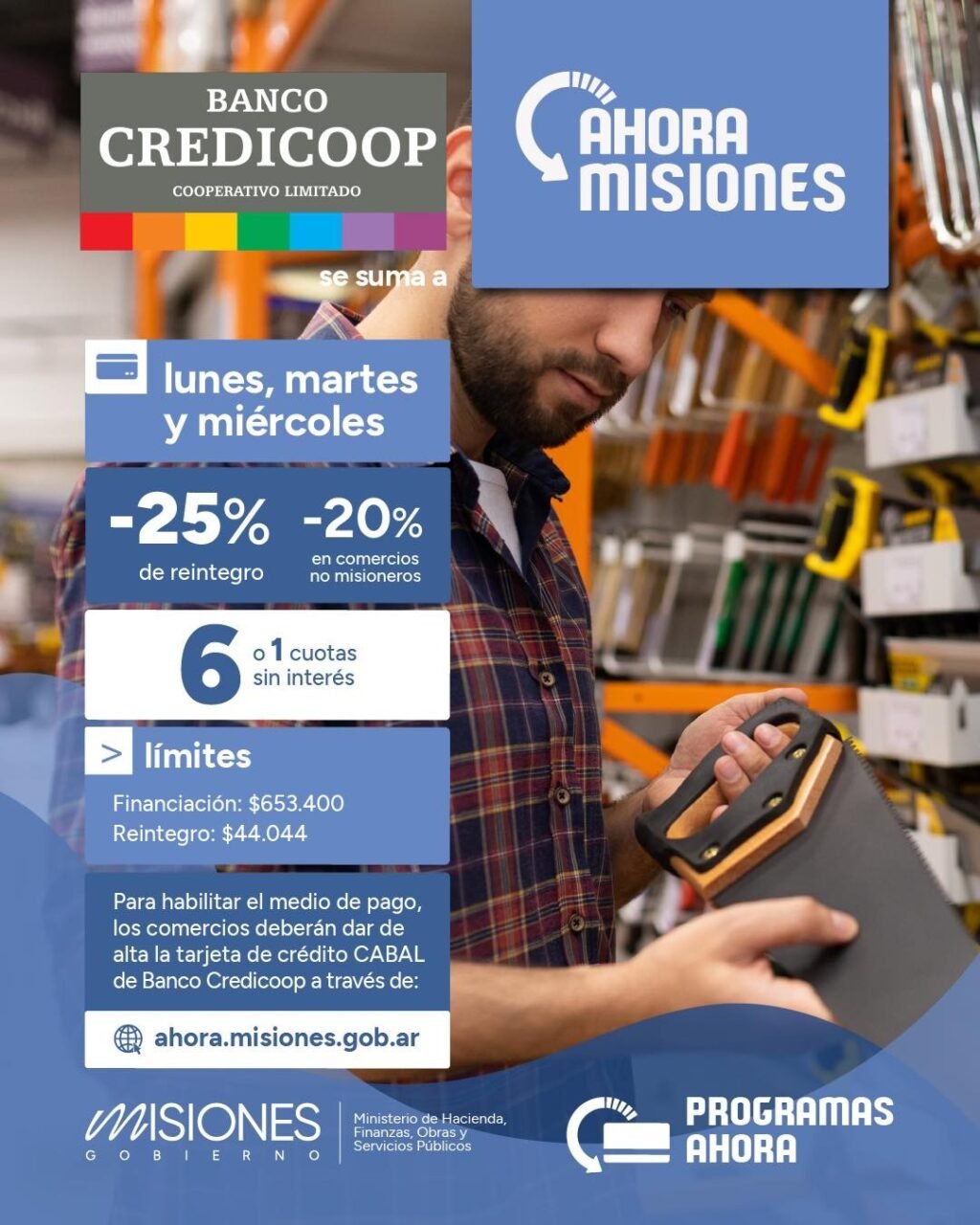 El programa Ahora Misiones está vigente todos los lunes, martes y miércoles y ofrece financiación en 1 o 6 cuotas sin interés, con un límite financiable de $653.400; y reintegros de 25% (20 % en comercios no misioneros) con un tope de $44.044. Estos beneficios, que ya se encontraban disponibles para las tarjetas Visa y Mastercard de Banco Macro; y Visa, Master y American Express de Banco Galicia; también estarán habilitados en los comercios adheridos para los usuarios de tarjeta Cabal de Banco Credicoop.