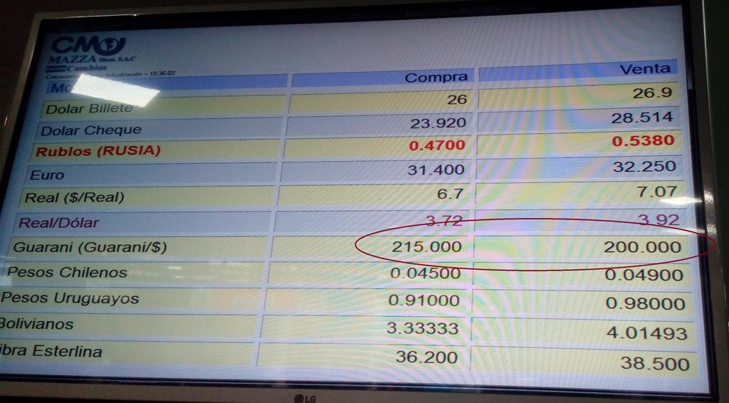 La corrida cambiaria contra el peso argentino (es incorrecto decir "suba del dólar") generó que el peso versus el guaraní quedara cerca de perforar el piso de 200 GPY por cada 1.
