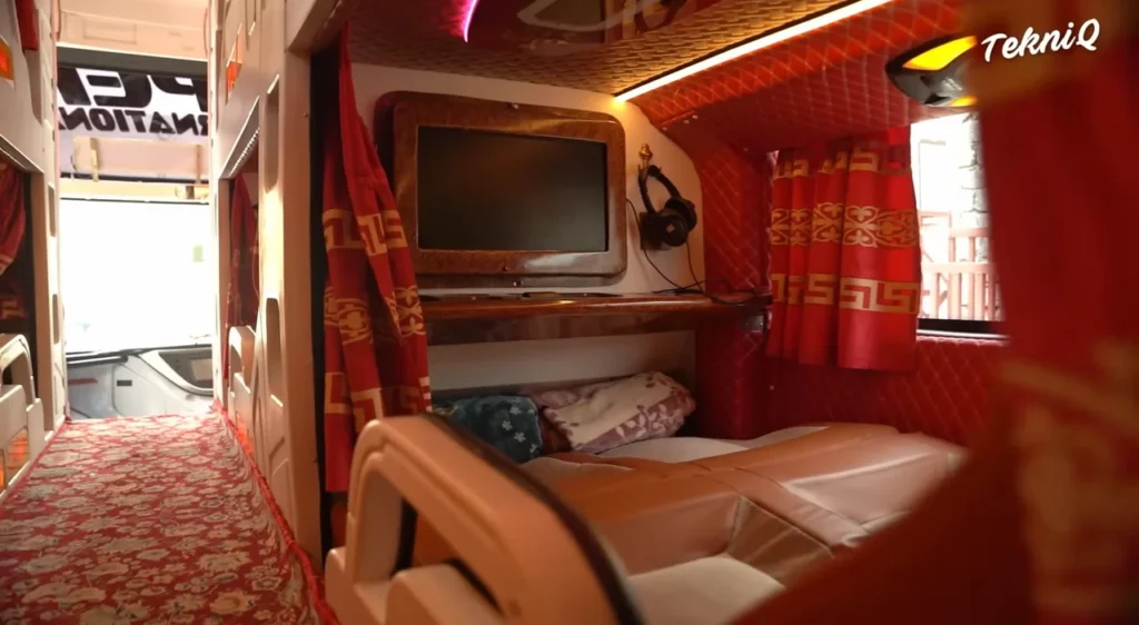 Este modelo de micro se llama popularmente “Limusina Plus” y tiene una clase ejecutiva 2×1 que cuenta con habitaciones con televisión LED, dos plazas confortables para descansar cómodamente, frazadas, cortinas para evitar la luz solar e incluso un teléfono para hablar directamente con el chofer.