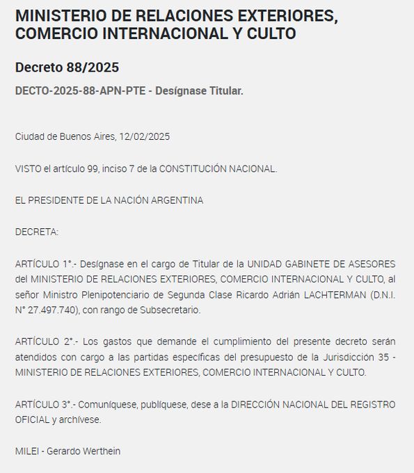 La medida fue oficializada mediante la publicación en el Boletín Oficial del decreto 88/2025, que establece: “Desígnase en el cargo de Titular de la Unidad del Gabinete de Asesores del Ministerio de Relaciones Exteriores, Comercio Internacional y Culto, al señor Ministro Plenipotenciario de Segunda Clase Ricardo Adrián Lachterman, con rango de Subsecretario”.