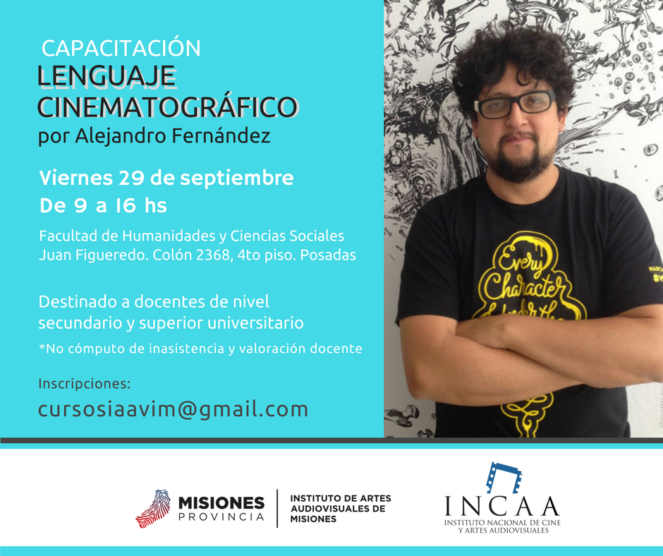 El viernes 29 de septiembre, también de 9 a 16 horas, se desarrollará el curso “Lenguaje Cinematográfico”, a cargo del realizador argentino, Alejandro Fernández.