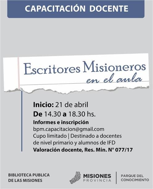 La Biblioteca Pública De Las Misiones, Parque del Conocimiento, retoma sus actividades –luego de Tecnópolis Federal Misiones- e inicia este viernes 21 de abril, una nueva propuesta de actualización profesional denominada “Escritores misioneros en el aula”, para el público del ámbito de la enseñanza. En esta oportunidad, docentes de nivel primario y estudiantes de IFD.