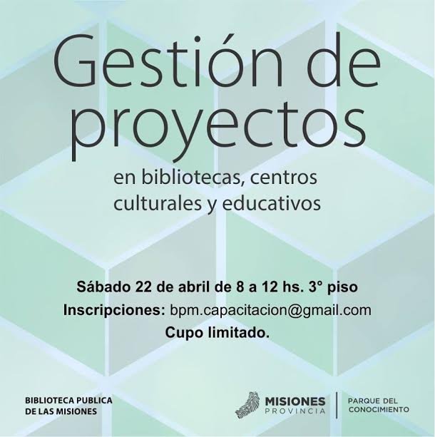 Por otro lado, también este próximo sábado 22 de abril de 8 a 12 Hs. será dictada nuevamente por la BPM, con la Prof. Mirta Miranda -debido a la gran demanda que tuvo esta capacitación-, la segunda edición del Taller de Gestión de Proyectos en bibliotecas, centros culturales y educativos. La misma fue pensada para quienes deseen que su organización amplíe su perspectiva pero carecen de las herramientas conceptuales, estructurales y metodológicas para formular proyectos.