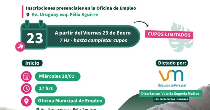 En el marco de las capacitaciones que se dictaron en el transcurso de este mes en la Oficina de Empleo municipal, este miércoles 28 a las 17 h en la sede de la oficina, Av. Uruguay y Felix Aguirre, se ofrecerá el taller de empleabilidad, que estará a cargo de la licenciada en RRHH y especialista en selección de personal, Valeria Segovia Mattos, quien brindó detalles acerca de la charla en Radio Municipal, FM 95.1.
