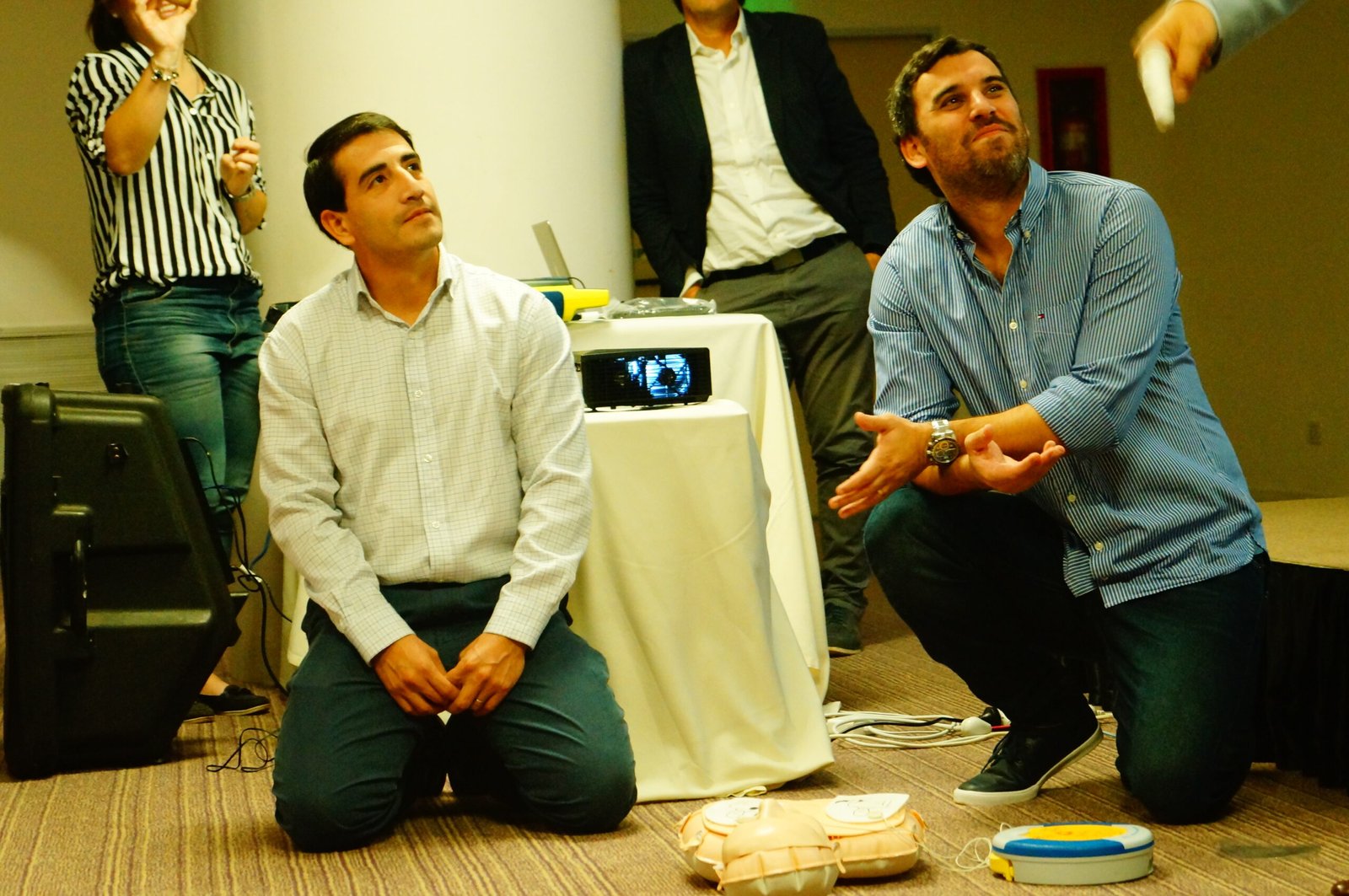 Recordó que para hacer RCP, el cuerpo debe estar sobre una superficie dura. Explicó como se debe hacer la resucitación cardiopulmonar, invitando a los participantes a practicarlo en un muñeco de práctica.