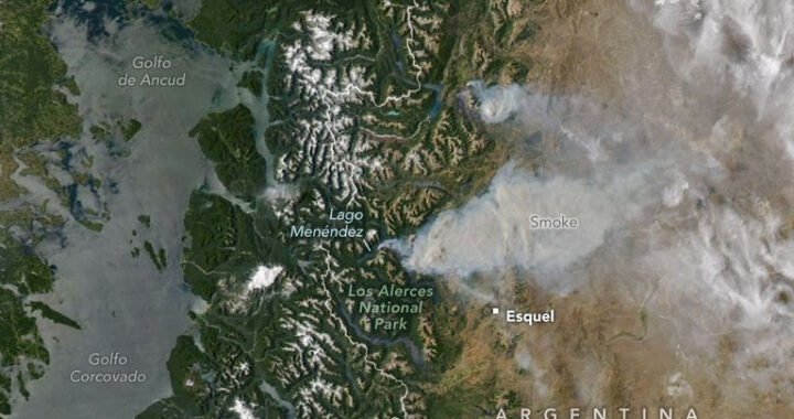 La imagen muestra “la columna de humo que emanaba de dos grandes incendios que ardían en el Parque Nacional Los Alerces y sus alrededores, declarado Patrimonio de la Humanidad por la UNESCO”, destaca la agencia.Impacto ambiental de los incendios forestales en la Patagonia