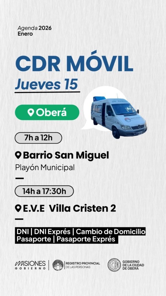 Este próximo jueves 15 de enero el Registro provincial de las Personas estará en nuestra ciudad realizando trámites de DNI, DNI Exprés, Cambio de Domicilio, Pasaporte, Pasaporte Exprés.