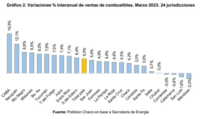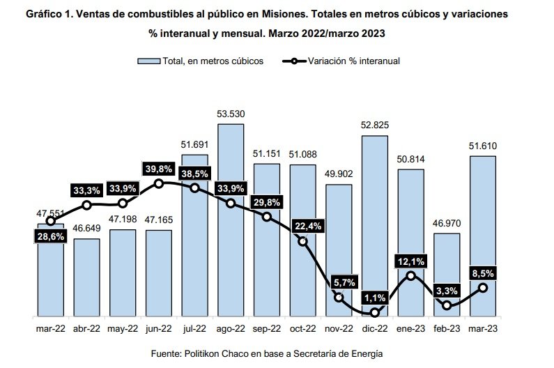 De acuerdo con los datos brindados por la Secretaría de Energía de la Nación, en la provincia de Misiones las ventas de combustible al público mostraron un alza del 8,5% interanual en el mes de marzo, la cuarta suba más alta del país y la mayor de todo el Norte Grande. Además, volvió a ratificar su posición de mayor consumidora de combustible en toda la región. Mensualmente también tuvo un incremento significativo, siendo la más alta del NEA, destaca un informe elaborado por la consultora Politikon Chaco en base a información de la entidad nacional.