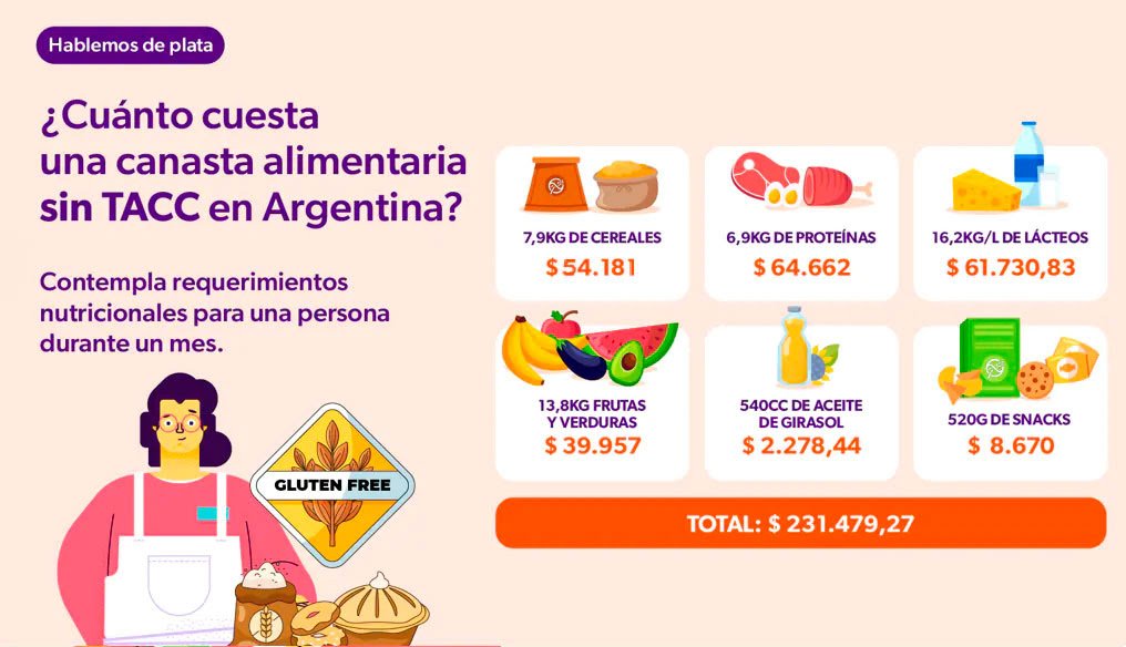 Un informe de la consultora Focus Market revela que mantener una dieta básica libre de gluten en Argentina implica un costo mayor que una canasta alimentaria tradicional. Según el relevamiento realizado para el blog de educación financiera de Naranja X, la canasta básica alimentaria sin TACC cuesta en promedio un 12% más que la canasta omnivora que cumple los requerimientos nutricionales de un adulto promedio.