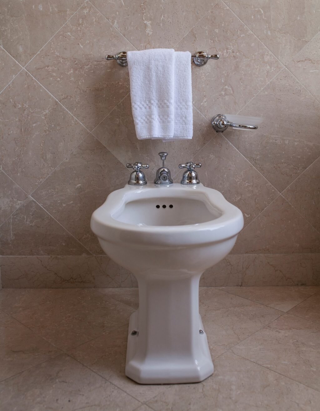 white and old bidet in a marble bathroom with a white towel