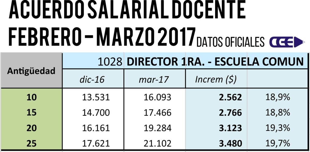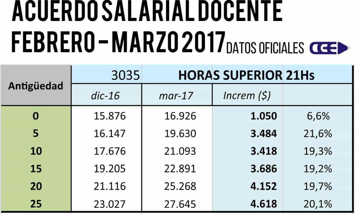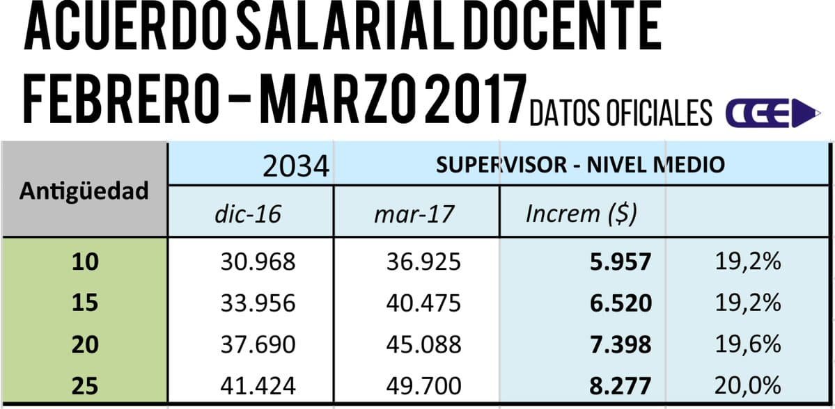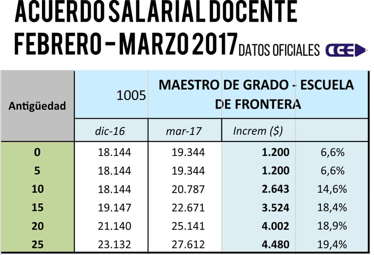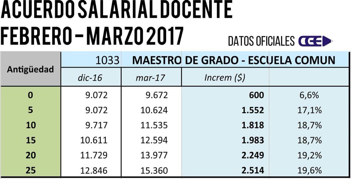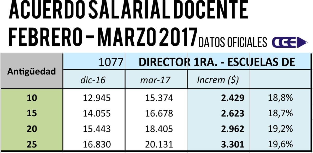 “Ya estamos en $4.100,77 y en enero era de $3.370,77, casi un 22 por ciento que va también a los jubilados, además seguimos trabajando en la antigüedad para evitar los achatamientos en la escala, producto del piso nacional. Se creo x decreto 101/17 adicional  (en blanco), y se aumentó de 18% al 24 % en el primer tramo que son los docentes de 1 a 6 años, es decir más volumen para aquellos que menos ganan. En el segundo tramo de 7 a 11 antiguedad, el aumento es del 19%, estaba en 13%, y en el último tramo que es el de máxima antigüedad que es de 12 en adelante nos vamos al 18 % que estaba en 8%; es decir se fue contemplando la antigüedad a través de este acuerdo”, manifestó a la prensa Leverberg.