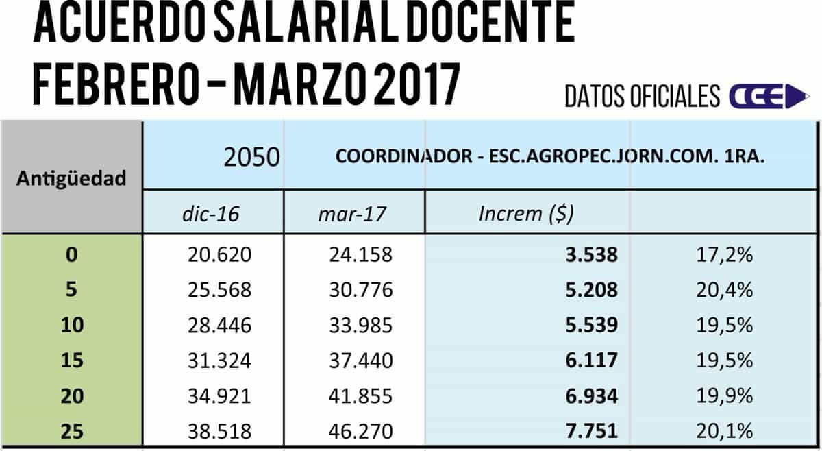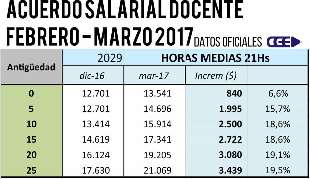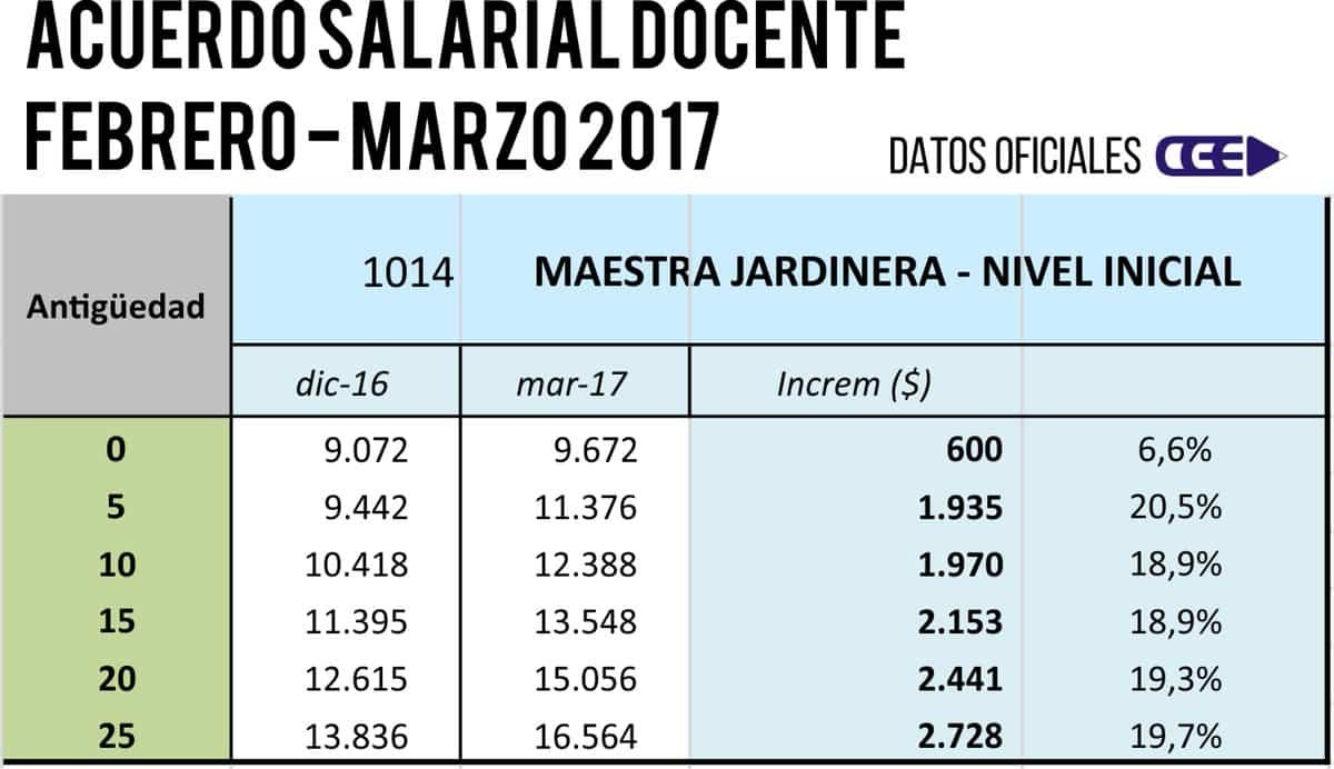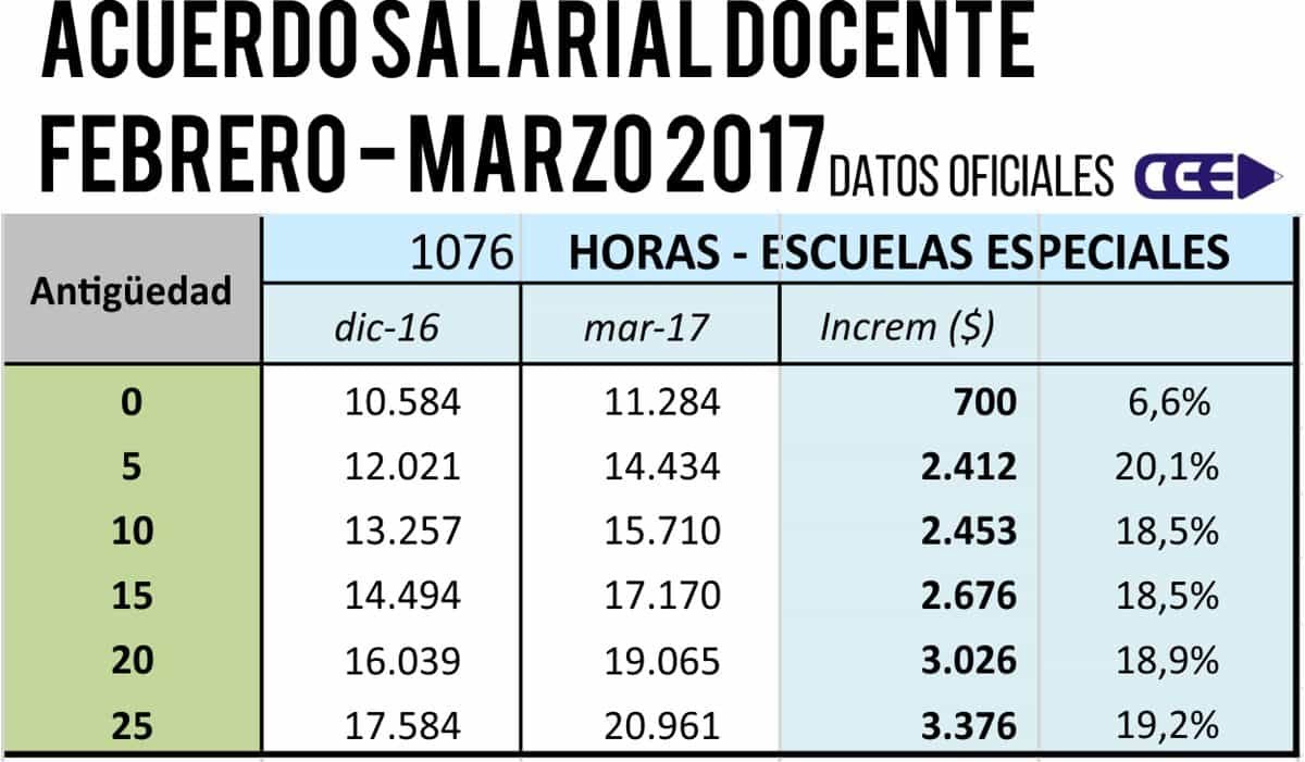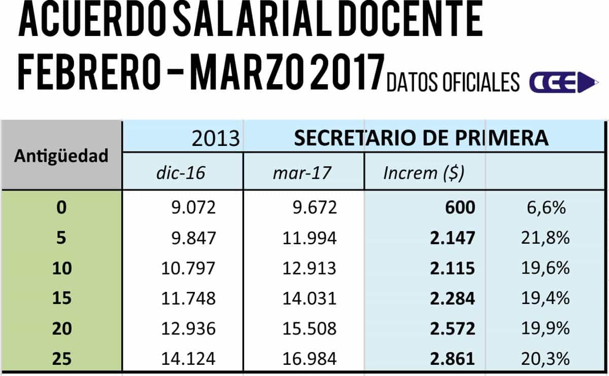 “Ya estamos en $4.100,77 y en enero era de $3.370,77, casi un 22 por ciento que va también a los jubilados, además seguimos trabajando en la antigüedad para evitar los achatamientos en la escala, producto del piso nacional. Se creo x decreto 101/17 adicional  (en blanco), y se aumentó de 18% al 24 % en el primer tramo que son los docentes de 1 a 6 años, es decir más volumen para aquellos que menos ganan. En el segundo tramo de 7 a 11 antiguedad, el aumento es del 19%, estaba en 13%, y en el último tramo que es el de máxima antigüedad que es de 12 en adelante nos vamos al 18 % que estaba en 8%; es decir se fue contemplando la antigüedad a través de este acuerdo”, manifestó a la prensa Leverberg.