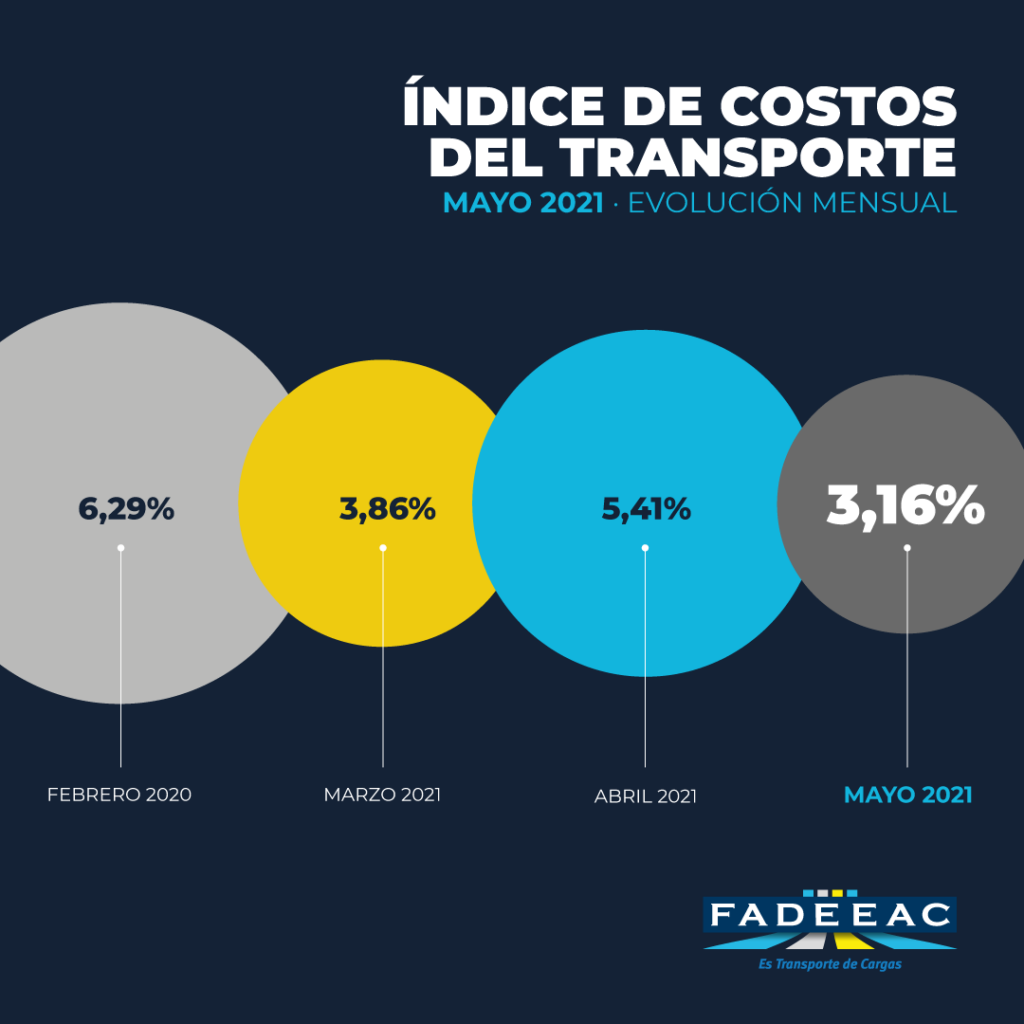 El Índice de Costos de Transporte de FADEEAC (ICTF) volvió a exhibir en mayo otro incremento, que fue del 3.16%. Con esta suba, en los últimos doce meses transportar mercadería por camión aumentó el 55,6%, y un 26% en lo que va de 2021.